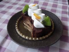 モワールショコラ。結局こんな感じのデコレーションに。うん、良いんじゃない?ケーキがかなりしっかり濃厚チョコなんで、甘さ控え目の生クリームを多めに絞って。これくらいないとバランス悪いんだなー。珈琲と良く合う大人ケーキ。