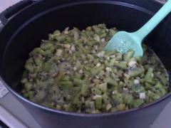 キウイさんをカットしてこちらも下煮。ファンが多い人気のキウイバナナジャム、明日には完成。