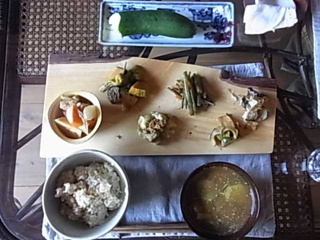 おおっと!これが噂の前菜、朝採れキュウリまるごと一本!!パリッと弾けて新鮮。どんどん食べちゃいそうになるけど、お食事が入らなくなったらいけないんで1/2でセーブ。
