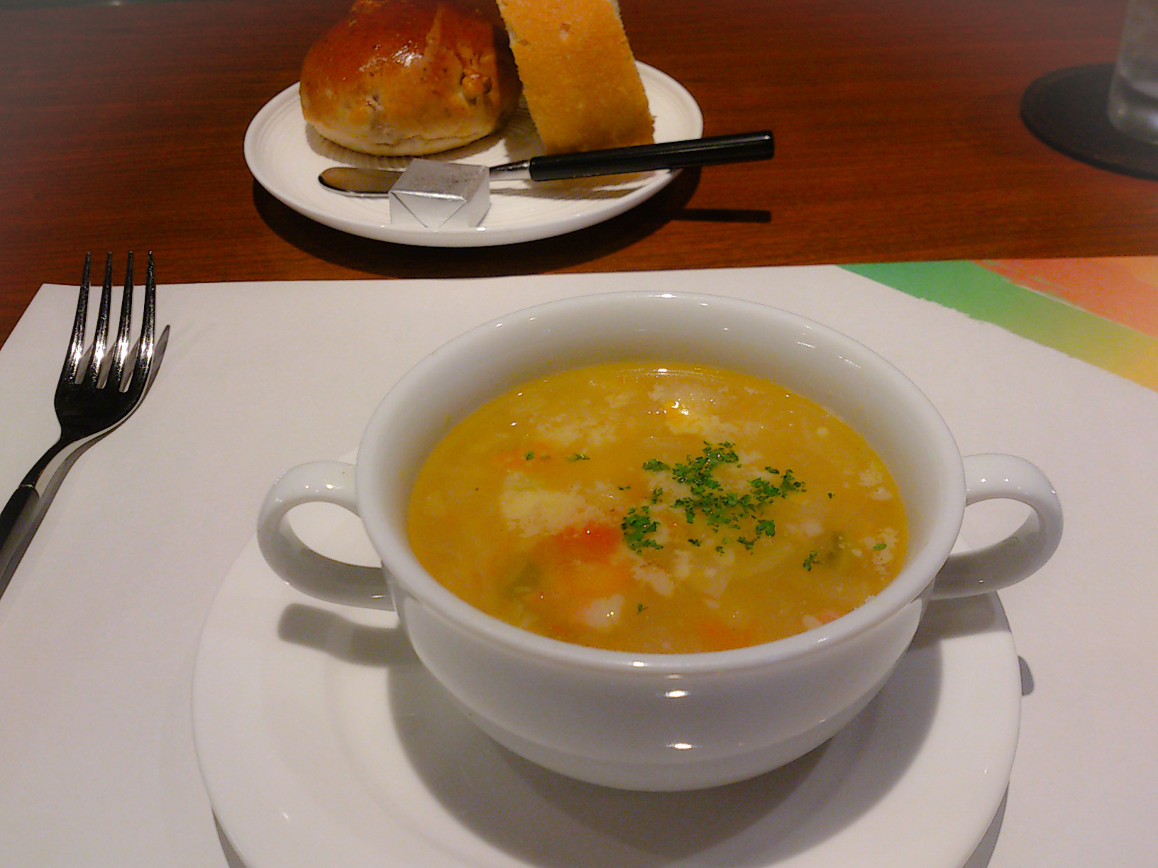古賀駅前のキュイジーヌ ゲンナイでランチ。オープン当初伺った事あったんだけど、最近、多数の方から賞賛のお声を耳にするので。日替わりランチ(1300円)。先ずはスープに
