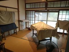 こるりさんの藍染。閉店後はこの様に日焼け防止で布を被せます。天然色素がいかにデリケートかって事です。
