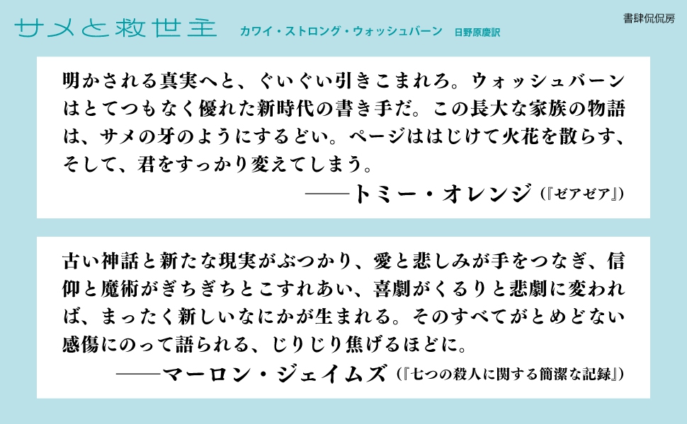 明かされる真実へと、ぐいぐい引きこまれろ。ウォッシュバーンはとてつもなく優れた新時代の書き手だ。この長大な家族の物語は、サメの牙のようにするどい。ページははじけて火花を散らす、そして、君をすっかり変えてしまう。