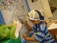塗り絵を楽しむのは○産大写真学部の学生さん。カエル帽子もお似合いです☆
