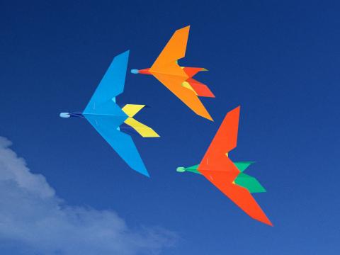 OriBird-SPARROWは鳥のイメージで作った色の組み合わせがいろいろ楽しめる折り紙飛行機です。両面カラー折り紙を三角にカットして色の異なる2枚を折って組み合わせ、ホッチキスでとめます。