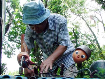 古い自転車やタイヤ、水道管かガス管の廃棄物を転用して手製でつくっています。もともと、こういう工作物が趣味なひとなのかな。工場とか経営しているひととか、発明マニアとか。そういう職業を想像していました。