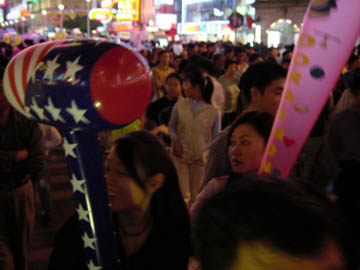 しかも、こんな風船をもった一群がいて、風船トンカチを手にした一群同志がすれ違うと、トンカチであいてをぶったたいてもよい、という暗黙の決まりがあるようなのです。