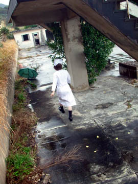 この日は、雨まじりの強風が吹き付ける廃虚にとっては、とても無気味な世界になっていて、ろくに太陽もなく、まるで暗鬱な北国の冬のような風景なのでした。それなのに、わずかな太陽光線を拾い集めて反射しているかのように白衣が輝いていたのです。