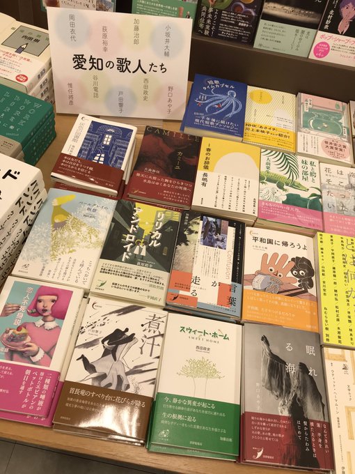 2020.09.14 フェア 丸善ヒルズウォーク徳重店にて書肆侃侃房フェアがはじまりました。 名古屋の丸善ヒルズウォーク徳重店にて書肆侃侃房フェアがはじまりました。 『四隣人の食卓』『うたうおばけ』『お砂糖とスパイスと爆発的な何か』『短歌タイムカプセル』『林檎貫通式』のほか、愛知の歌人の歌集も展開していただいています。