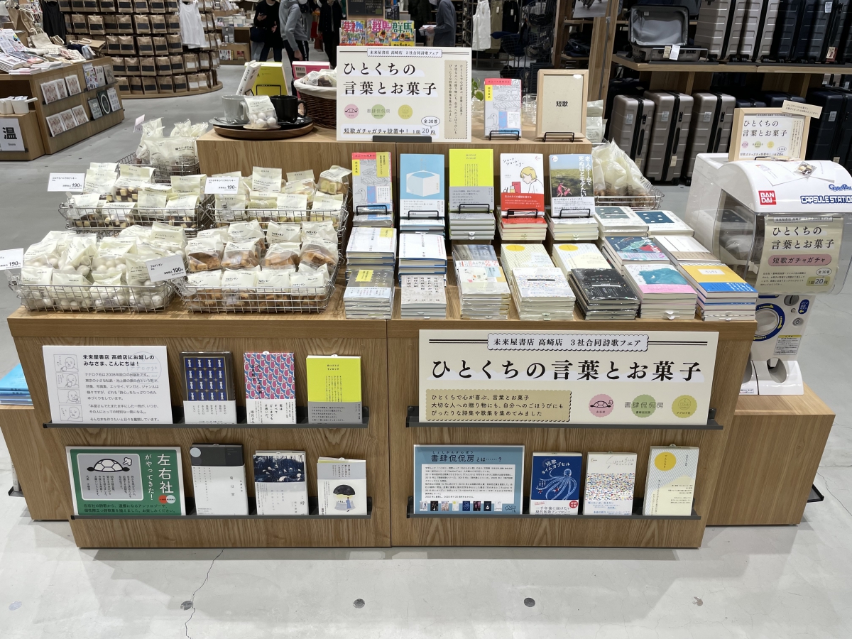 2022.03.28 フェア 未来屋書店高崎店にて詩歌フェア「ひとくちの言葉とお菓子」が開催中です。 群馬県 未来屋書店高崎店にて、左右社・ナナロク社との合同詩歌フェア「ひとくちの言葉とお菓子」が開催中です! (5月下旬までの開催予定) 書肆侃侃房からは、新鋭短歌シリーズ最新刊『ショート・ショート・ヘアー』『老人ホームで死ぬほどモテたい』『イマジナシオン』のほか、『青い舌』『恋人不死身説』などを展開しています。 売り場には、無印良品のお菓子付き短歌ガチャガチャ(1回20円)も設置しています。 どうぞお立ちよりください。