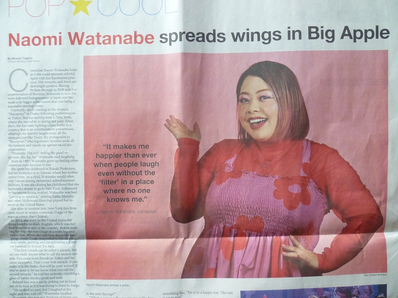 もう一つ、ジャパン・ニュース掲載の話題から。こちらは読売新聞の翻訳だが、もともとの記事を読んでいないので新鮮な気持ちで読んだ。お笑い芸人の渡辺直美さんの活躍を紹介したいわゆるフィーチャー記事。私は彼女のファンではないが、海外で言葉のハンデや体型に臆することなく活躍する彼女のことは好ましく思っていた。大学の授業でも彼女が欧米の舞台で演じたパフォーマンスを取り上げたことがある。