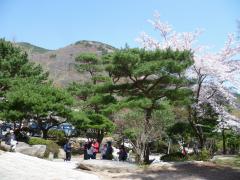 お寺への道すがら周辺の景色をデジカメで撮ったが、山桜が散り始めている頃でとても良かった。日本の桜とは異なる印象を受けたが、それでも桜は桜。多くの人が喜々としてシャッターを切っていた。