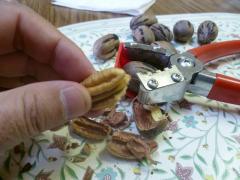 (写真は上から、ヒックス夫人から届いたピーカン。夫人の自宅でピーカンの殻を専用の器具で割っているところ。恵み豊かなピーカンの木。台所に立つヒックス夫人)