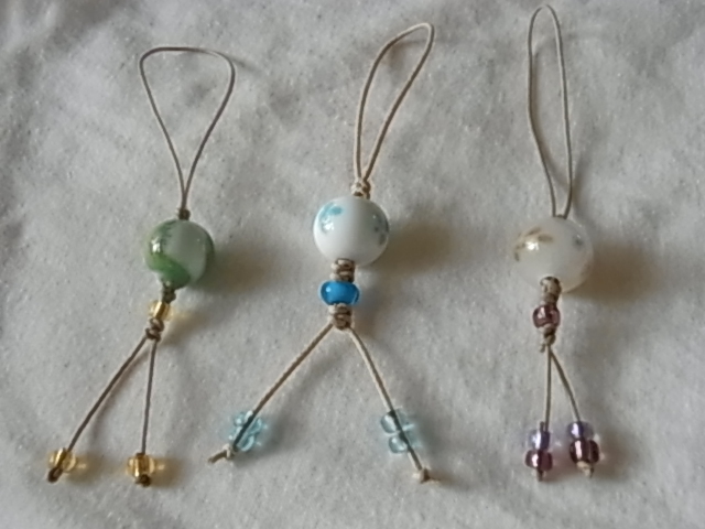 ストラップに。ちなみに玉も縄編みも、左2つが母作成。一番右が私。やっぱり色使いに個性が出るみたい。