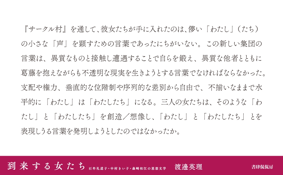 「『サークル村』を通して、彼女たちが手に入れたのは、儚い「わたし」(たち)の小さな「声」を顕すための言葉であったにちがいない。この新しい集団の言葉は、異質なものと接触し遭遇することで自らを鍛え、異質な他者とともに葛藤を抱えながらも不透明な現実を生きようとする言葉でなければならなかった。支配や権力、垂直的な位階制や序列的な差別から自由で、不揃いなままで水平的に「わたし」は「わたしたち」になる。 三人の女たちは、そのような「わたし」と「わたしたち」を創造/想像し、「わたし」と「わたしたち」とを表現しうる言葉を発明しようとしたのではなかったか」(渡邊英理)
