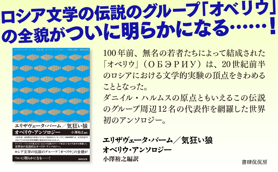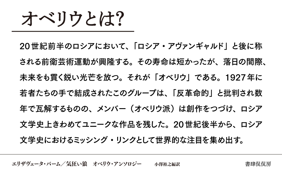 100年前、無名の若者たちによって結成された「オベリウ」(ОБЭРИУ)は、20世紀前半のロシアにおける文学的実験の極致をきわめた。ダニイル・ハルムスの「エリザヴェータ・バーム」「出来事」新訳、これまで未邦訳だったニコライ・ザボロツキー「気狂い狼」、コンスタンチン・ヴァーギノフ「スヴィストーノフの仕事と日々」、レオニード・リパフスキー「水論」など、この伝説のグループ周辺12名の代表作を網羅した世界初のアンソロジー。