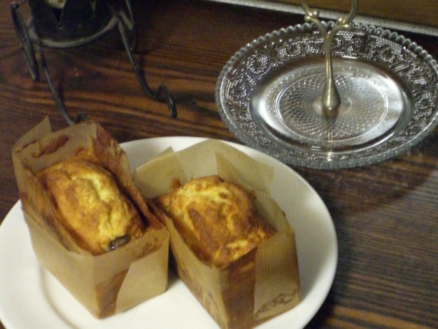 ダイニングテーブルと色を変えて正解。お店に展示してあった品物なので、良い感じに色あせてアンティーク調です。 これからの季節、ガラスの器なんか飾ったら良さそうですね。 でも、今回は試作のパウンドケーキを置いてみました。