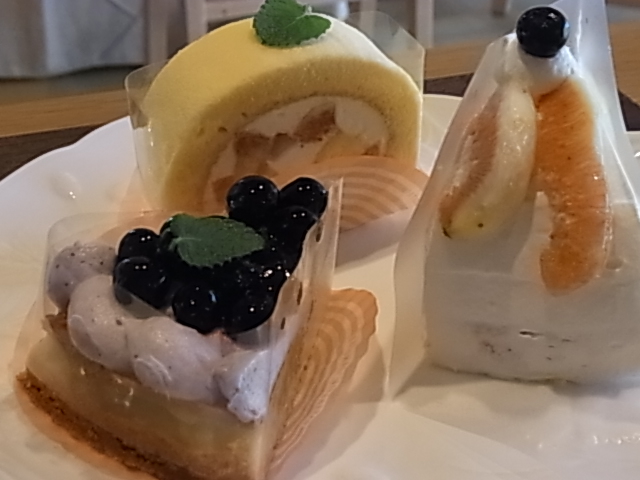 今週末のケーキ3種。ブルーベリータルト、無花果&ピーチ生ショート、無花果&ブルーベリーのスフレロールです。