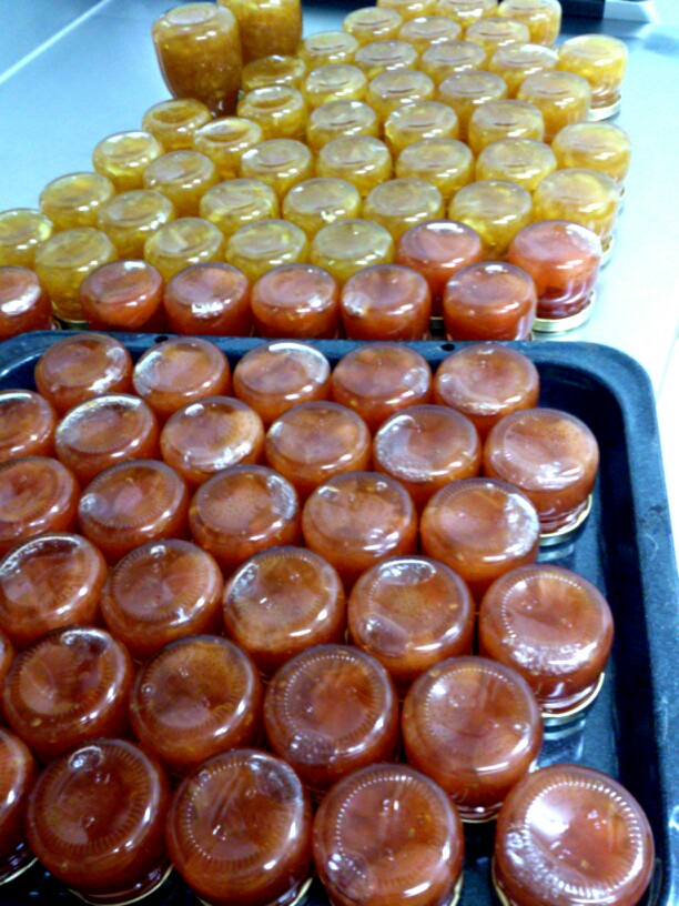 バイト後の力作。ブライダルのプチギフト、ミニジャム小粒。カラメル紅玉×40,あまおうトマト×40の計80個。新婦さんがラッピングをしたいので早めに欲しいとのことで、予定を早めました。バイトの後だったんでかなり時間が押しちゃった。