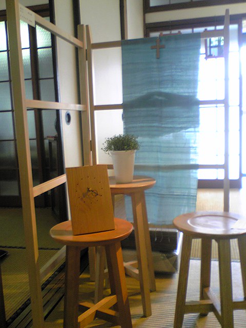 常連の馬乗りさんからK+さんの作品「衣かけ」に6月展示会予定の草木染スカーフを素敵にディスプレイしてもらった。これで「衣かけ」の上手な使い方がイメージできる。これまたありがとう。