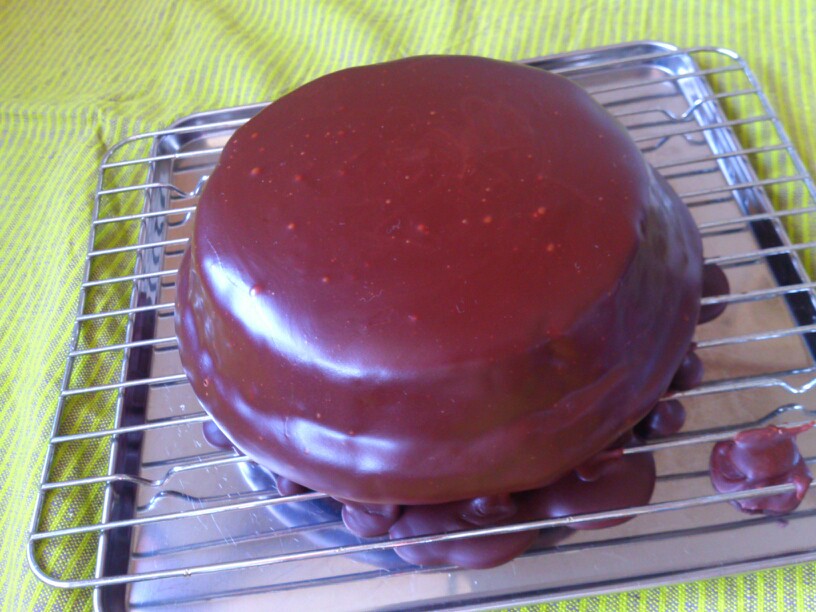 チョコがけ大成功!このチョコチョコしいザッハトルテ、中は思ったよりフワッとしてます。とっても贅沢なケーキなんでチョコ好きさん、是非お召し上がり下さい。