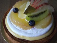 タルトの上にアーモンドクリームを絞って焼いた生地にカスタードと生クリームを乗せてフルーツで飾りました。