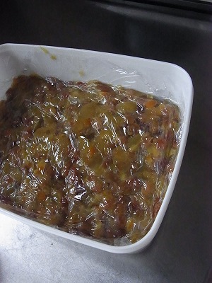 フルーツチャツネ完成。これを密閉容器で冷蔵庫保管するんだけど、適当なのが見当たらないんで琺瑯かなんかで探します。