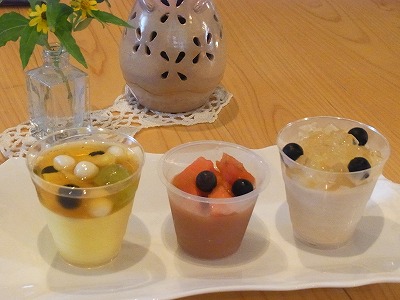 かぼちゃ杏仁豆腐(左)、真夏のジュレ(中)、桃ヨーグルトムースカップ(右)です。かぼちゃ杏仁には先日試作した豆腐団子を