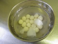 こんな感じに真ん丸くちっちゃくしてin。硬くなっちゃう点はお砂糖を少し加えて防止。カラメルシロップの琥珀色に白いお団子が何だかとっても秋らしくて綺麗。見た目は大事なんだね、本日完売(ありがとうです)。