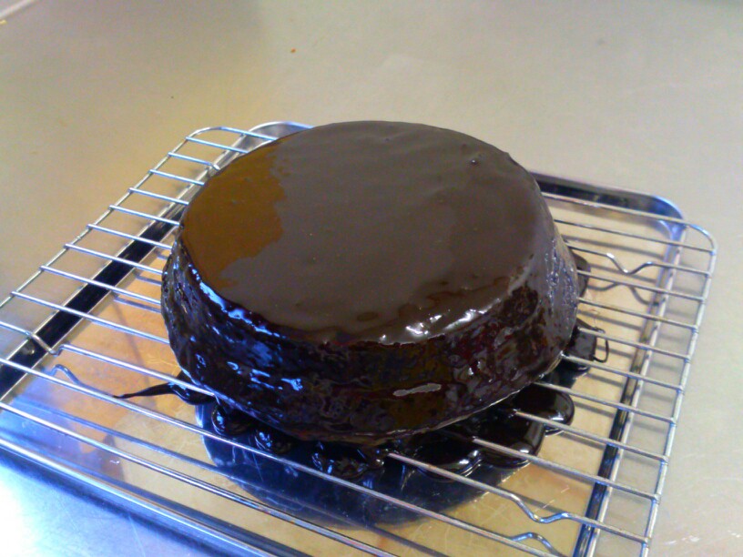 ザッハトルテ完成。只今グラサージュショコラを完全に落ちるのを待ってるとこ。どうですか?この艶っつやなケーキ肌。フランス産高級ココアを使用。