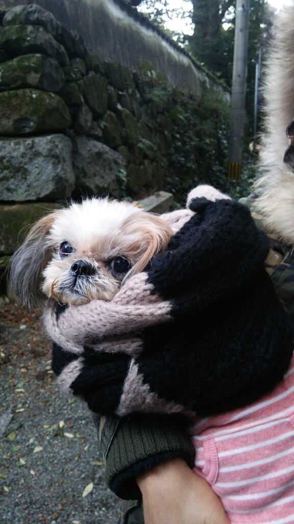 ガッタガタ震えてた、こいつ。足元悪くて歩きたがらないもんだから体温は低下の一途。私のスヌードかけてあげてちょいセレブ?