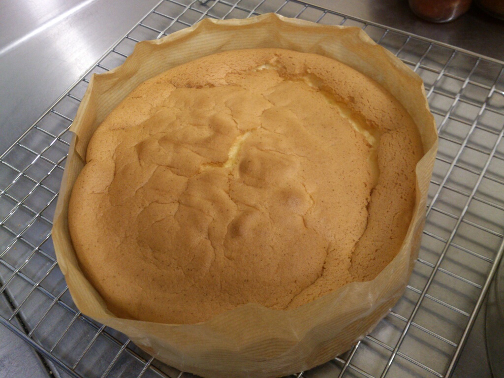 こっちは例のシフォンのスポンジケーキ。バイト先でやはり4回やってもうまくいかないと言うシェフと一緒に試行錯誤でやってみたんだけど、やはりしぼんじゃったらしい。