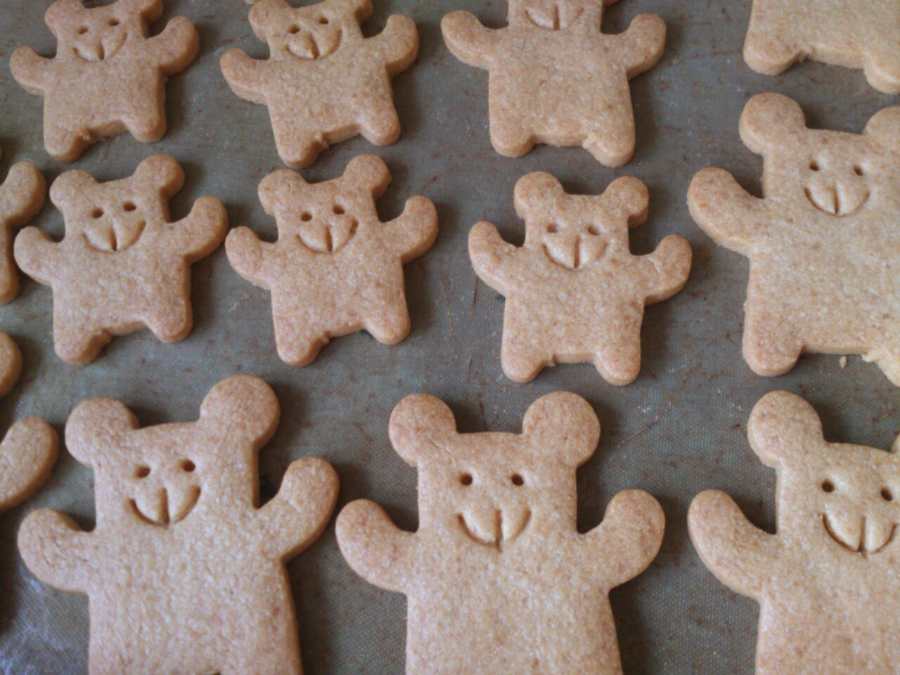 くまさんのきなこクッキー。きなこ感強めたくって砂糖を半減させてたらかなりのきなこ具合!これは理想的なんだけど…、強度が弱まった。よく言えばホロホロ感が出たって感じです。でも個人的に、このきなこまんまを頬張ってる様なホロホロ感が気に入ったので暫くこれで行きます。優しく扱ってね!