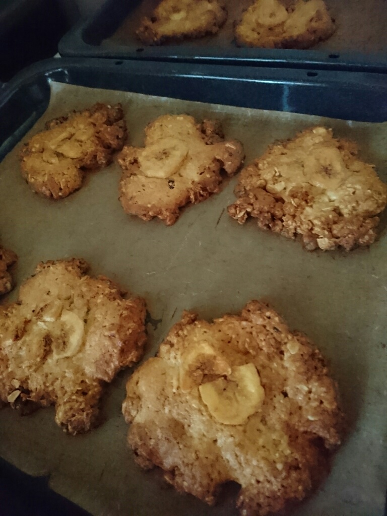 数日前に焼いたバナナグラノーラクッキーをまた早々に焼く。バター系クッキー、見る見るバターが溶けていく。