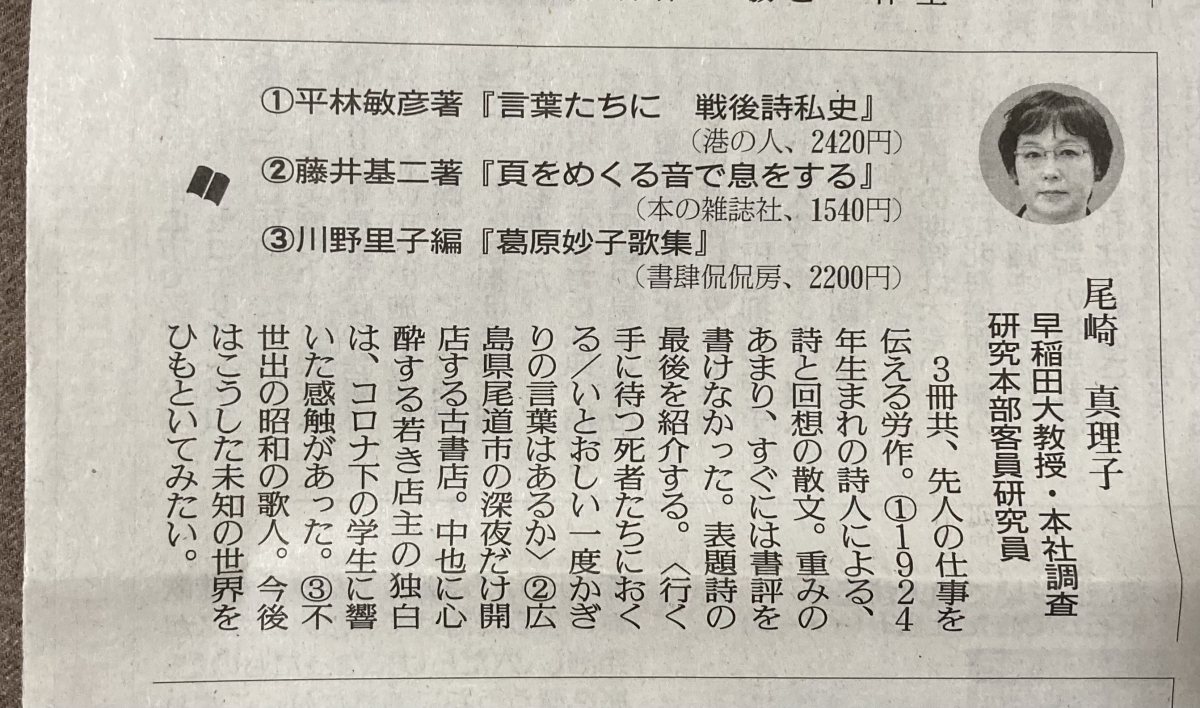 2021.12.26 書評 読売新聞(12/26)の「読書委員が選ぶ2021年の3冊」で、尾崎真理子さんに『葛原妙子歌集』を選んでいただきました。 読売新聞(12/26)の「読書委員が選ぶ2021年の3冊」で、尾崎真理子さんに『葛原妙子歌集』を選んでいただきました。 「先人の仕事を伝える労作」と。ありがとうございます。 http://www.kankanbou.com/books/tanka/0491