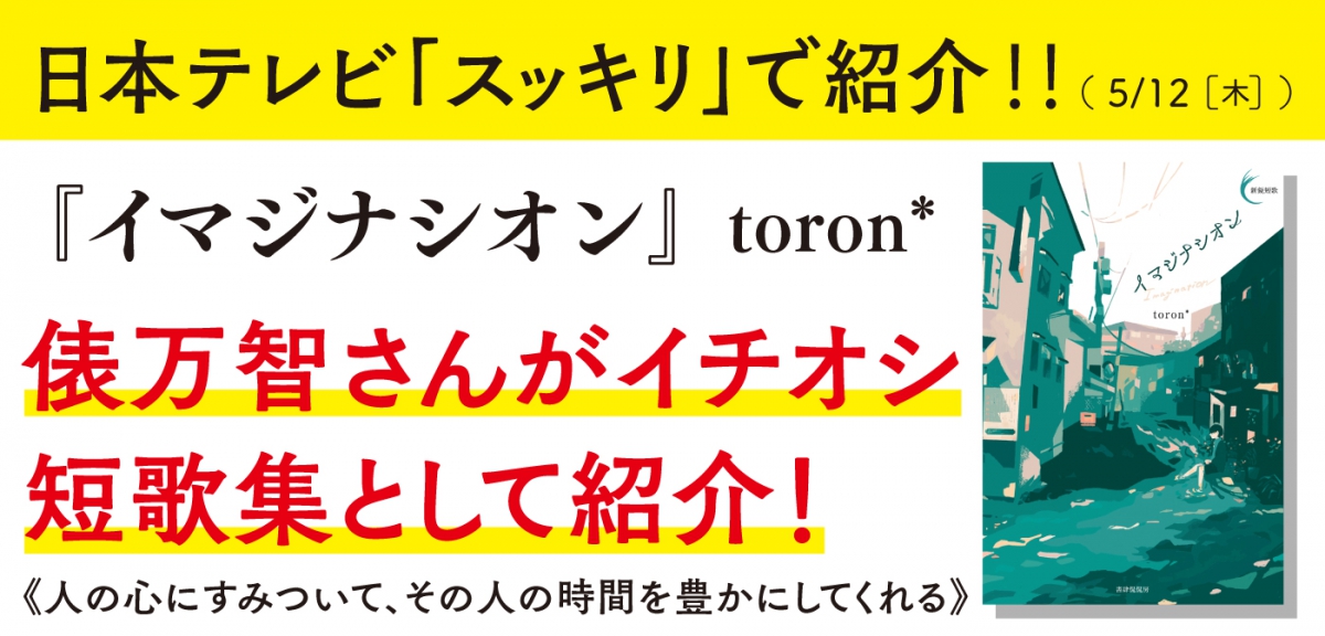 本日放送の日本テレビ「スッキリ」で放送された「短歌ブーム特集」にて、俵万智さんがイチオシ短歌集としてtoron*『イマジナシオン』を紹介してくださりました!