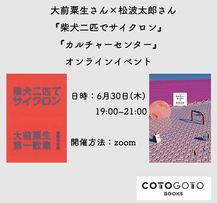 (6/30)『柴犬二匹でサイクロン』の大前粟生さんと『カルチャーセンター』の松波太郎さんの特別対談を配信します(COTOGOTO BOOKS)