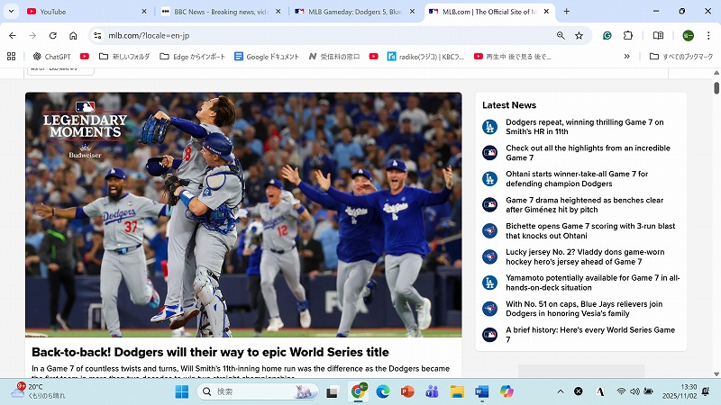 ワールドシリーズ。ドジャースが見事に逆転勝利でブルージェイズとの対戦成績を4勝3敗として優勝を飾った。昨年に続く優勝であり、ドジャースとしては初の連覇を達成した。