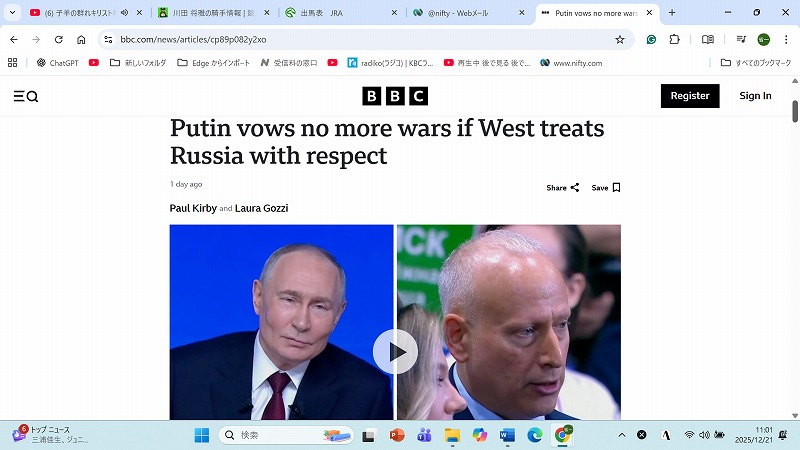 プーチン大統領が4時間を超えるロシア国民との質疑応答に際して、BBCのロシア編集担当責任者の質問に答える形で述べたのだとか。大統領は欧米諸国の北大西洋条約機構(NATO)がかつて東欧には手を出さないと約束したのに、その約束を反故にして東欧にまで進出してきたように、我々を再び欺さないならば、ロシアによるウクライナ侵攻が終息する可能性を示唆したようだ。プーチンウオッチャーならこの興味深い発言の真意は分かるのだろう。そうでない私は脳内を??が駆け回る。ウクライナ侵攻が勃発してもうじき4年。ウクライナを打ち負かせないプーチン政権が音を上げつつあるように見えなくもない。